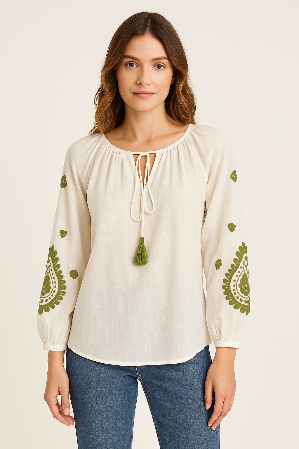 Bluzë e lehtë dhe e rehatshme me stil boho, perfekte për përditshmëri. Kjo bluzë vjen me mëngë të gjata të zbukuruara me dizajne etnike në ngjyrë jeshile dhe me lidhëse elegante në pjesën e qafës me një detaj dekorativ. Kombinohet lehtësisht me xhinse, funde apo pantallona për një look modern dhe të lirshëm.