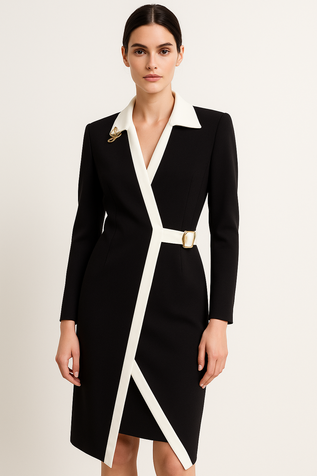 Fustan klasik dhe modern njëkohësisht, me prerje asimetrike dhe kontrast elegant midis ngjyrës së zezë dhe bardhës. Ka mëngë të gjata, jakë të bardhë me formë të rafinuar dhe detaj ari në rrip që thekson belin. Materiali është i butë dhe qëndron bukur në trup, duke dhënë një pamje të rregullt dhe të sofistikuar.