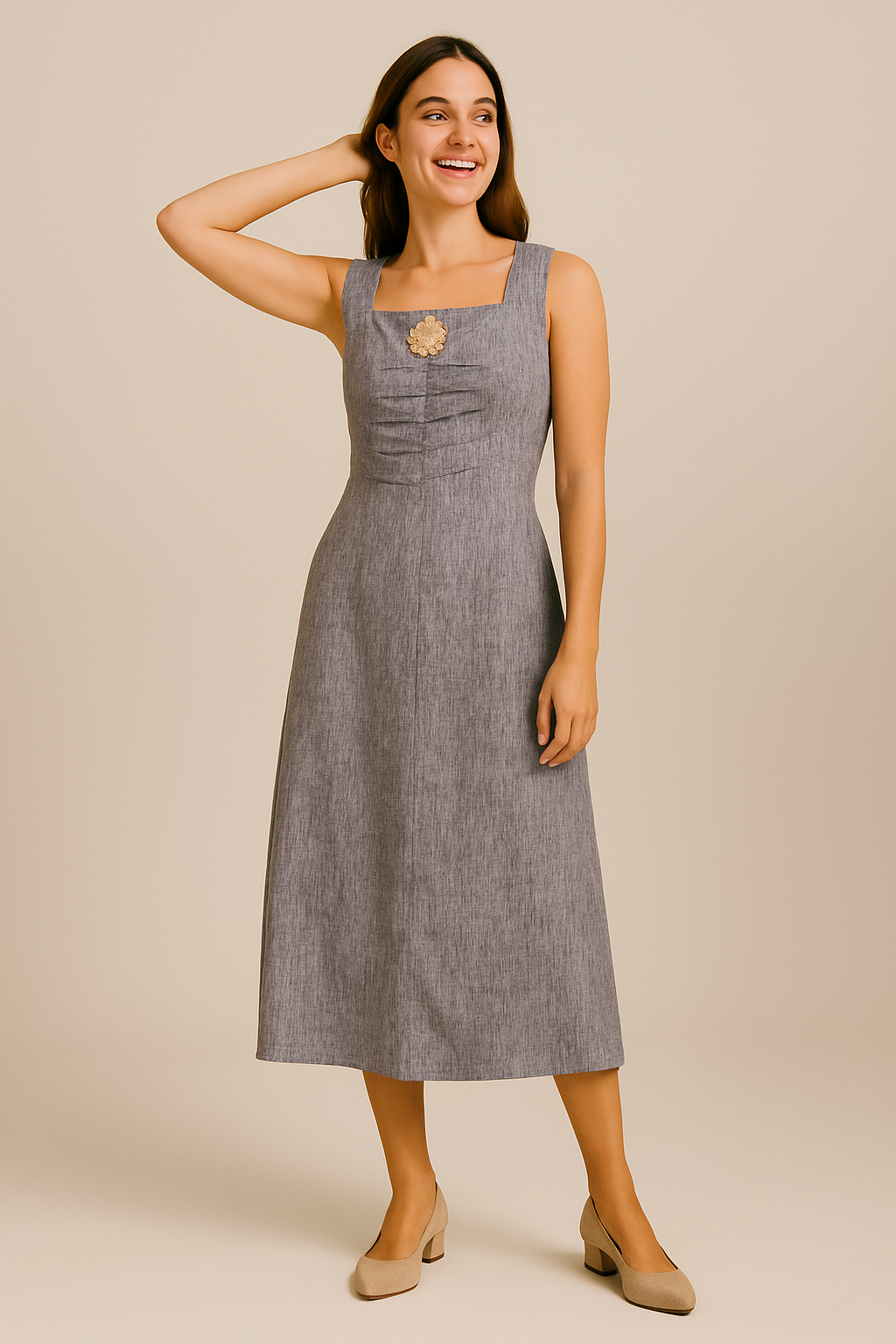 Fustan gri pa mëngë me prerje klasike dhe detaj elegant në pjesën e sipërme. Material i lehtë dhe i rehatshëm, perfekt për stil zyrtar ose evente speciale.
