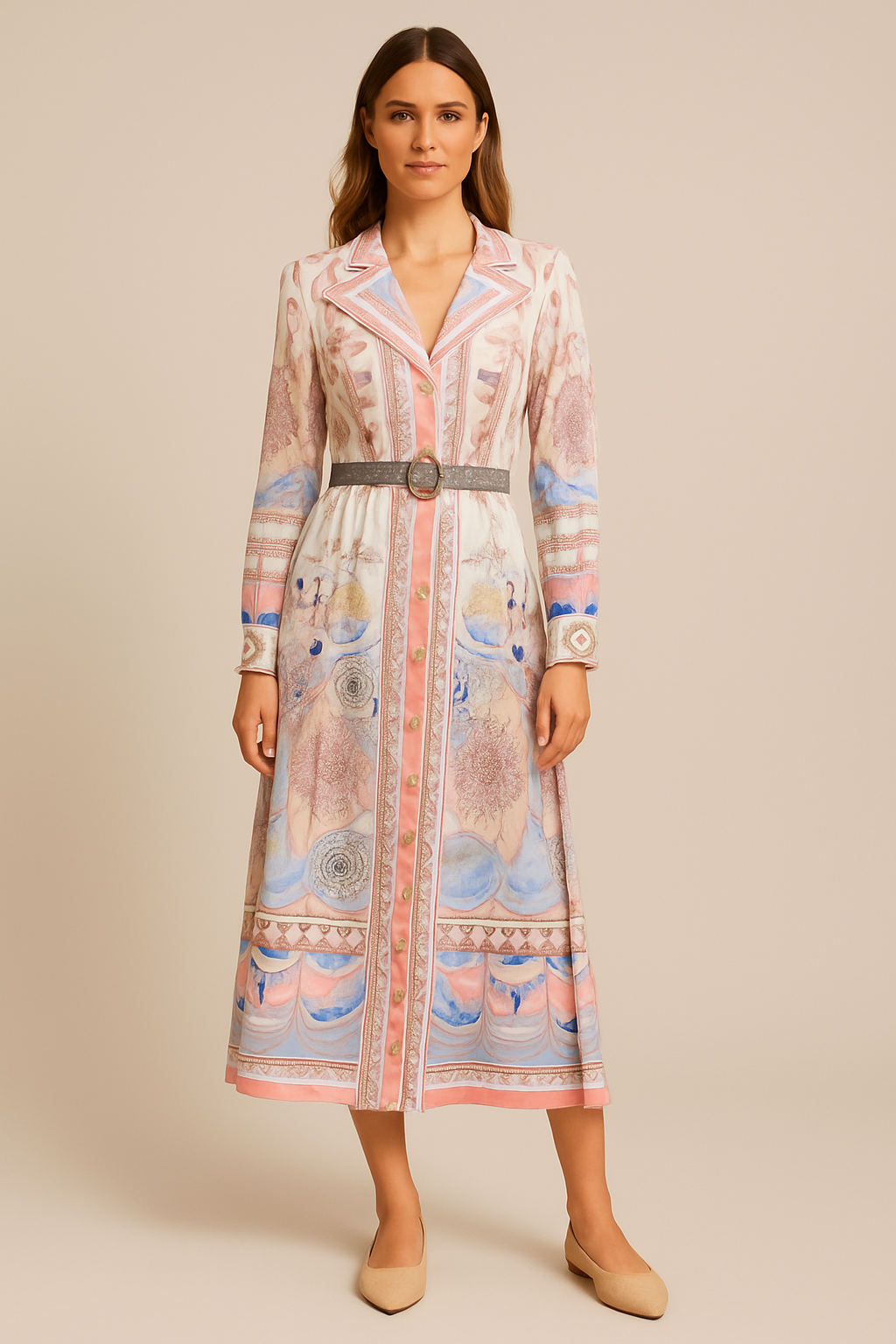 Fustan i gjatë me mëngë të gjata dhe jakë klasike. Print dekorativ shumëngjyrësh me motive artistike. Mbyllje me kopsa përpara dhe rrip në bel për të theksuar siluetën.