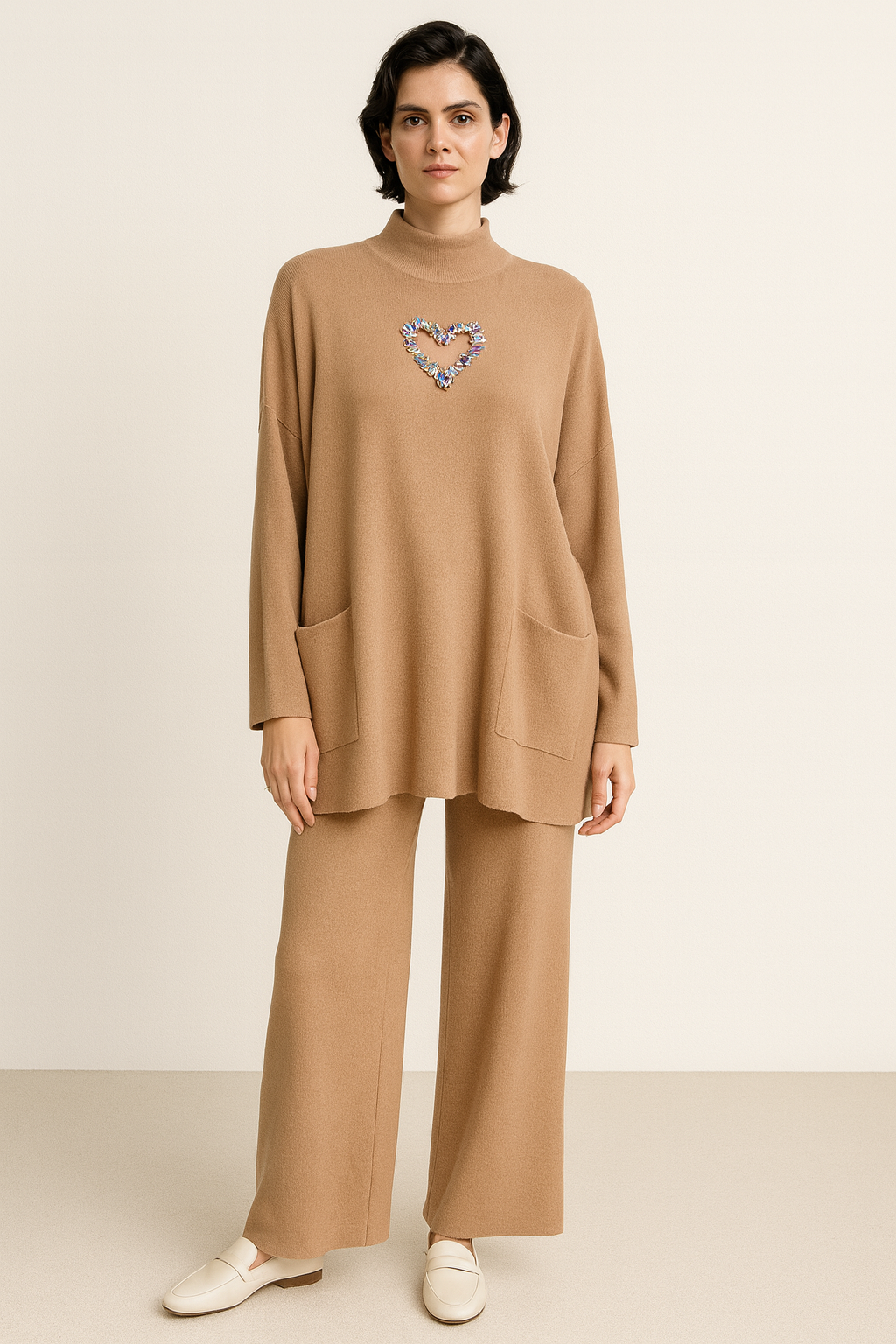 Kostum bezhë trikote me bluzë të gjerë dhe detaj zemre