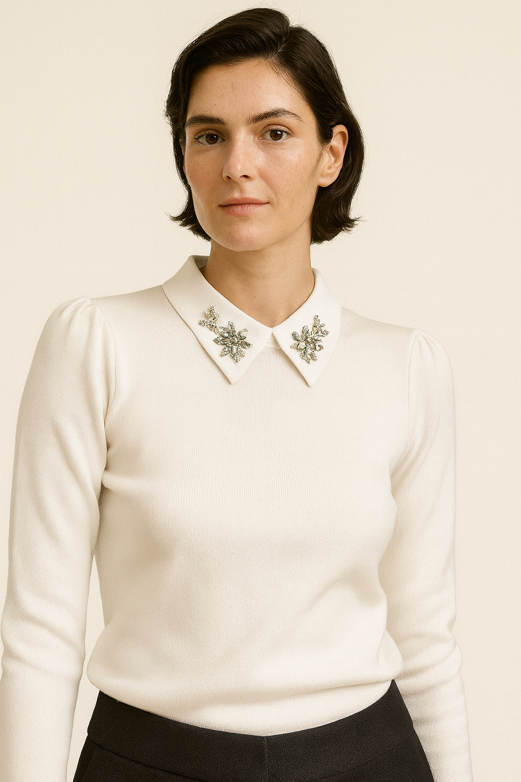 Pulovër fine dhe elegante në ngjyrë krem, me dizajn minimalist që theksohet nga jakë e bardhë me gurë kristal të ndritshëm. E punuar me material të butë dhe elastik, përshtatet bukur me trupin duke ofruar rehati dhe elegancë në të njëjtën kohë.