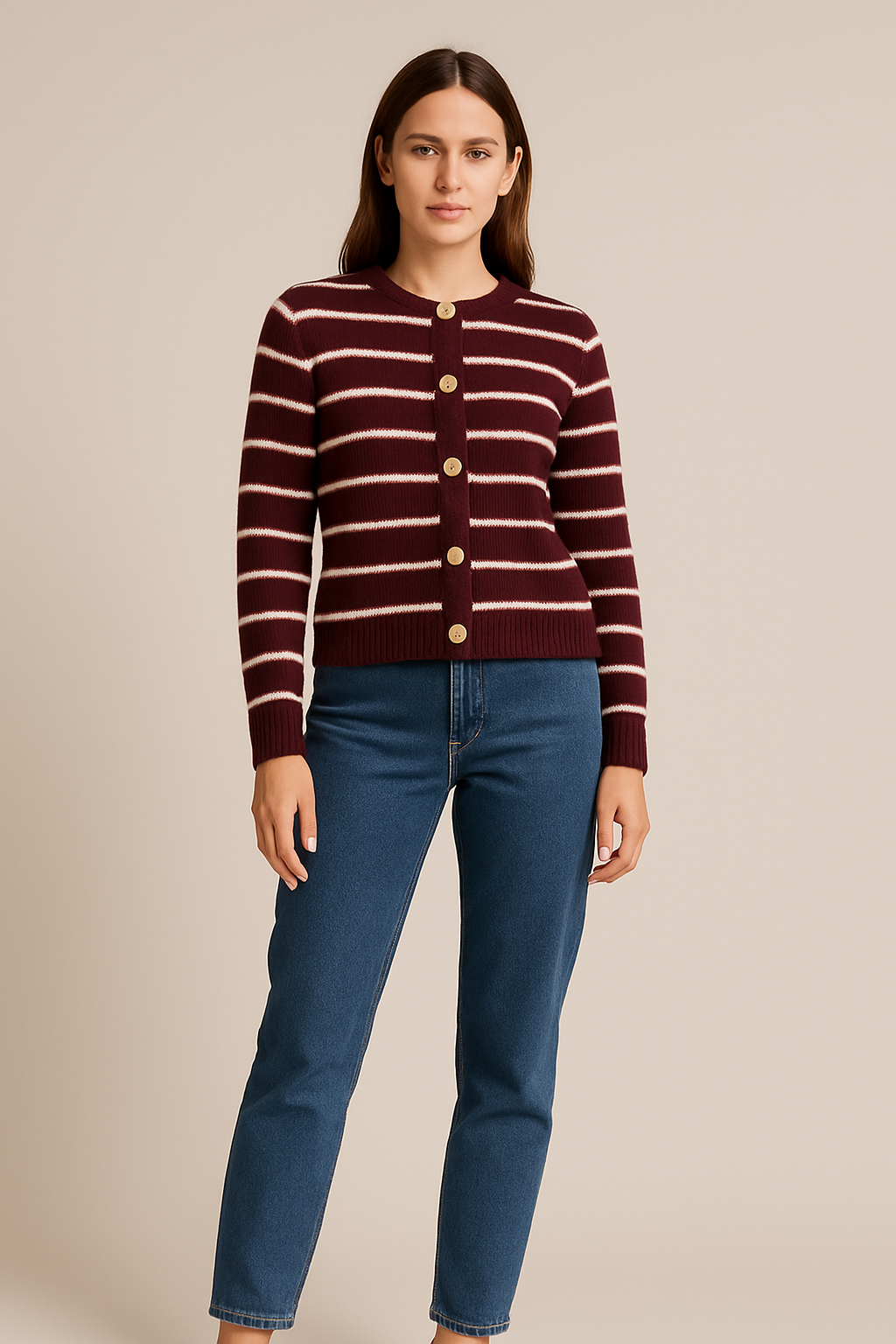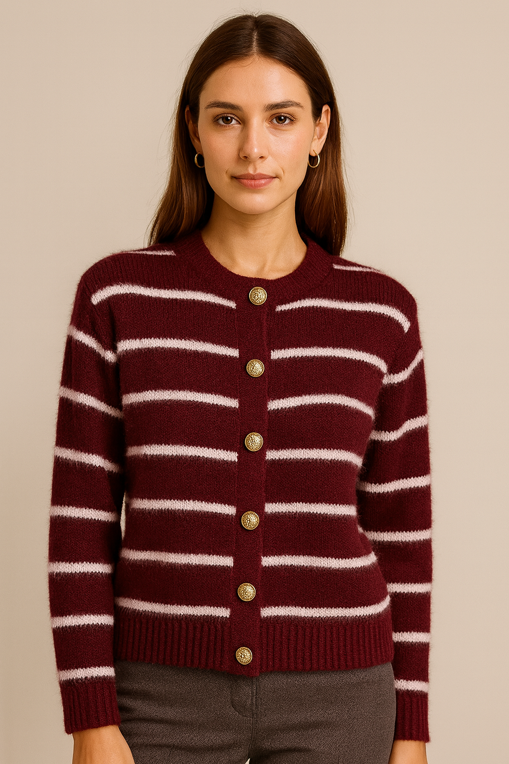 Triko me mëngë të gjata dhe dekolte të rrumbullakët. Model me vija horizontale në burgundy dhe të bardhë. Mbyllje përpara me kopsa dekorative në ngjyrë ari.