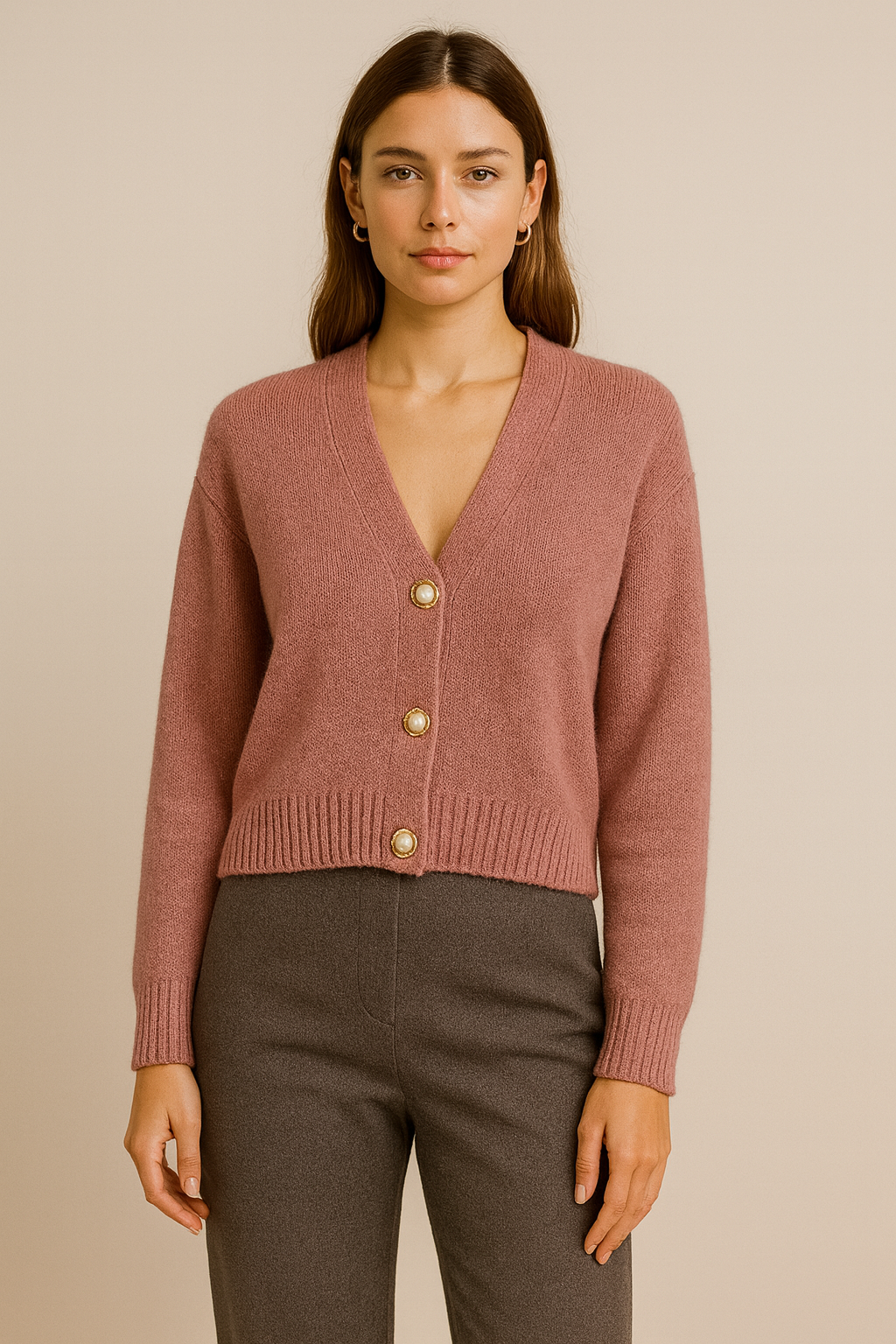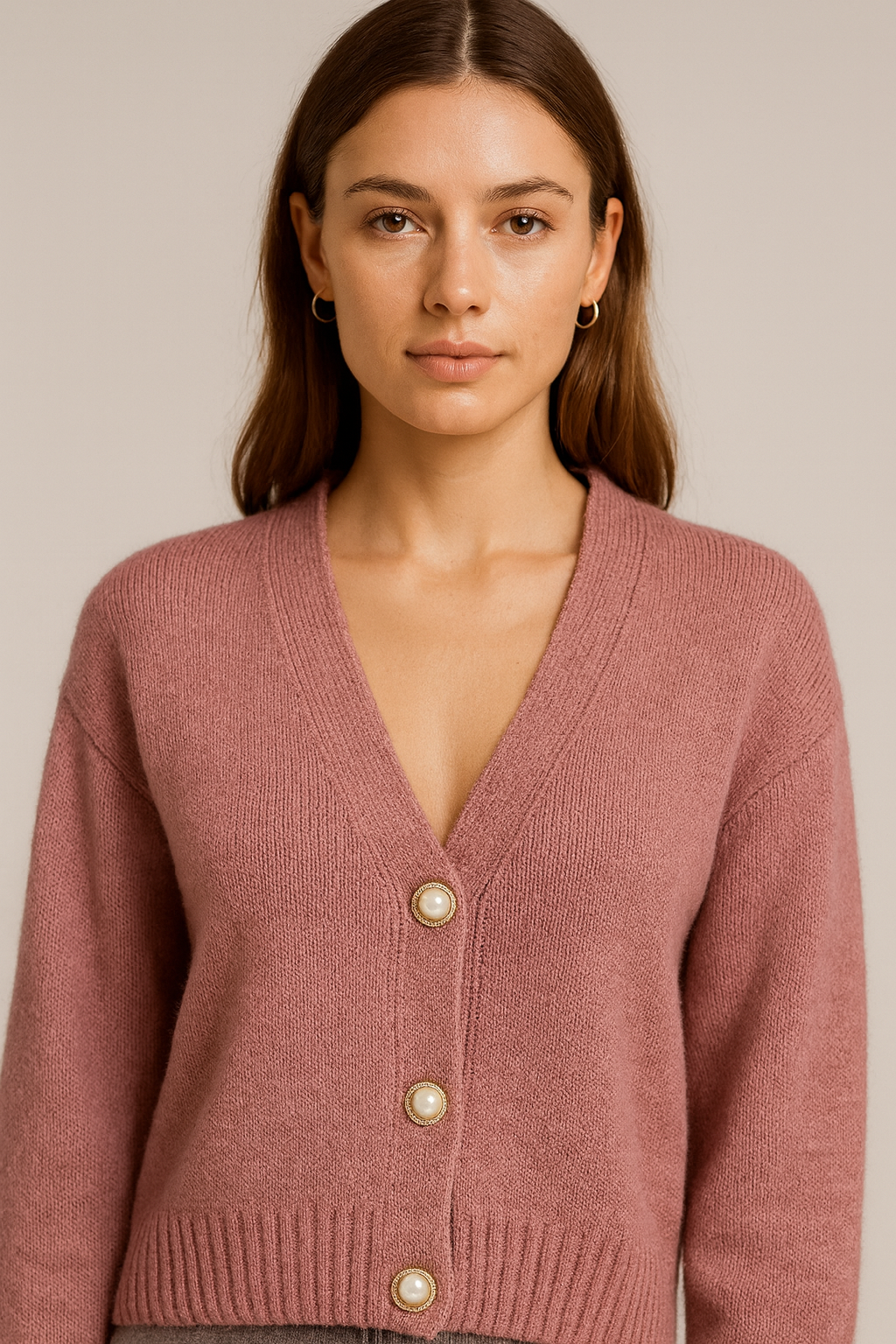 Triko me mëngë të gjata dhe dekolte V. Mbyllje me kopsa dekorative me efekt perle. Material i butë dhe komod, i përshtatshëm për kombinime elegante dhe casual.